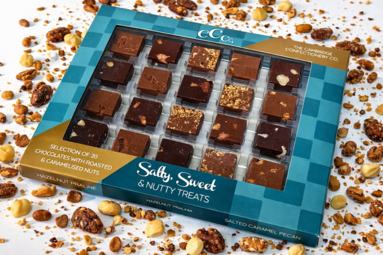 Ingredients: Sugar, Cocoa Solids (Cocoa Butter, Cocoa Mass), Whole MILK Powder, Emulsifier E322 (SOYA), Caramelised ALMONDS (ALMONDS, Sugar, Honey), Honey Roasted PEANUTS (PEANUTS, Sugar, Honey, Glucose- fructose Syrup, Rapeseed Oil, Salt, Thickener (Xanthan Gum E415)), Salted Carmel PECANS (PECAN NUTS, Sugar, Honey, Salt), HAZELNUT Praline ( Sugar, HAZELNUTS), MACADAMIA NUTS, Emulsifier E322 (SOYA), Natural Vanilla Flavouring. Dark Chocolate Contains; Minimum 55% Cocoa Solids. Milk Chocolate Contains; Minimum 33.5% Cocoa Solids, Minimum 22% Milk Solids.
