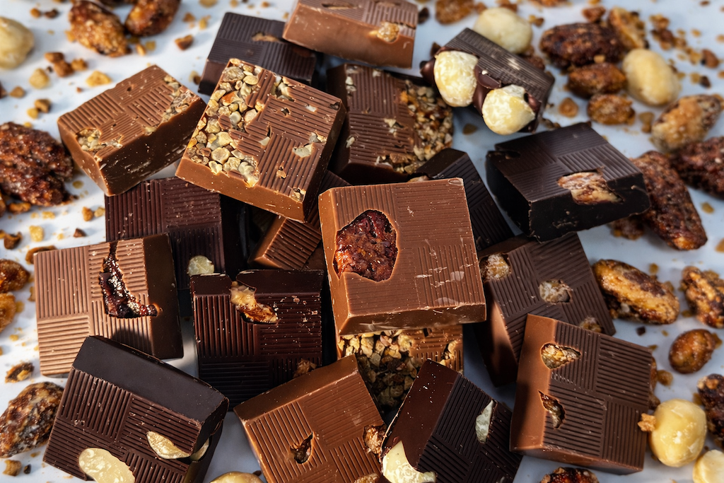 Ingredients: Sugar, Cocoa Solids (Cocoa Butter, Cocoa Mass), Whole MILK Powder, Emulsifier E322 (SOYA), Caramelised ALMONDS (ALMONDS, Sugar, Honey), Honey Roasted PEANUTS (PEANUTS, Sugar, Honey, Glucose- fructose Syrup, Rapeseed Oil, Salt, Thickener (Xanthan Gum E415)), Salted Carmel PECANS (PECAN NUTS, Sugar, Honey, Salt), HAZELNUT Praline ( Sugar, HAZELNUTS), MACADAMIA NUTS, Emulsifier E322 (SOYA), Natural Vanilla Flavouring. Dark Chocolate Contains; Minimum 55% Cocoa Solids. Milk Chocolate Contains; Minimum 33.5% Cocoa Solids, Minimum 22% Milk Solids.