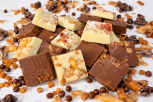 White Chocolate Contains; Minimum 28% Cocoa Solids, Minimum 26% Milk Solids.