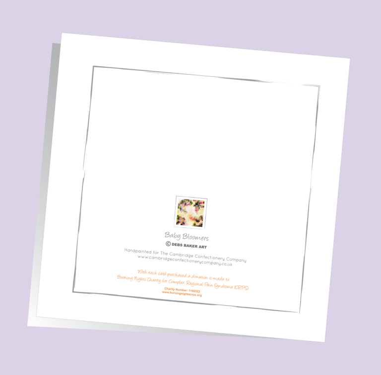 These gift cards were hand-painted by local artist and one of our very own company Directors, Debs Baker! Debs is both a Director of The Cambridge Confectionery Company and its’ fudge-making sister company; Calico Cottage UK. Building and growing Calico since 1991 alongside Managing Director and husband Nigel, Debs was integral in shaping the business into what we are today. In recent years, she has taken a step back from the hands-on day to day after the onset of a chronic pain condition; Complex Regional Pain Syndrome. When her body allows, Debs spends her time painting a huge variety of florals, abstracts, watercolour, collage or whatever she decides to challenge herself with next. We’re honoured to be able to feature a very special range of gift cards painted just for us!