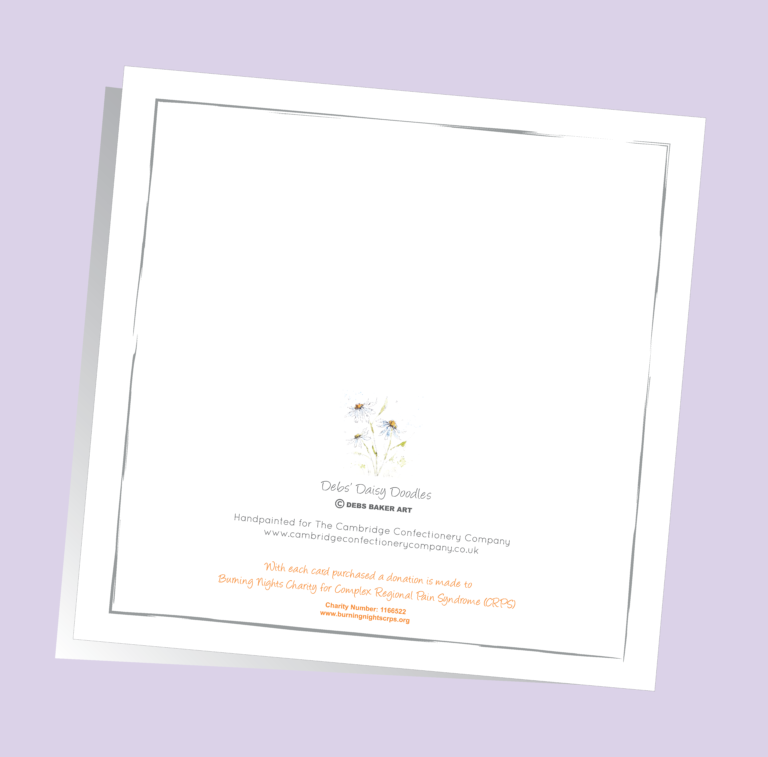 These gift cards were hand-painted by local artist and one of our very own company Directors, Debs Baker! Debs is both a Director of The Cambridge Confectionery Company and its’ fudge-making sister company; Calico Cottage UK. Building and growing Calico since 1991 alongside Managing Director and husband Nigel, Debs was integral in shaping the business into what we are today. In recent years, she has taken a step back from the hands-on day to day after the onset of a chronic pain condition; Complex Regional Pain Syndrome. When her body allows, Debs spends her time painting a huge variety of florals, abstracts, watercolour, collage or whatever she decides to challenge herself with next. We’re honoured to be able to feature a very special range of gift cards painted just for us!