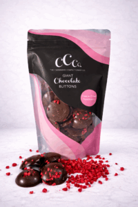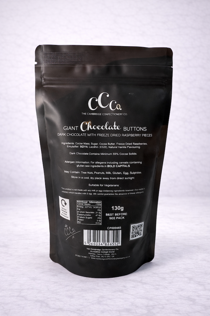 Ingredients: Cocoa Mass, Sugar, Cocoa Butter, Freeze Dried Raspberries, Emulsifier: SOYA Lecithin (E322), Natural Vanilla Flavouring.
