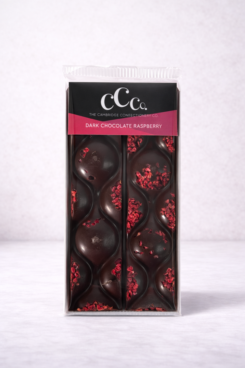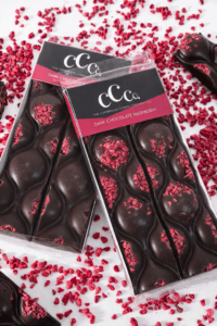 Ingredients: Cocoa Mass, Sugar, Cocoa Butter, Freeze Dried Raspberries (2%), Emulsifier: SOYA Lecithin (E322), Natural Vanilla Flavouring.