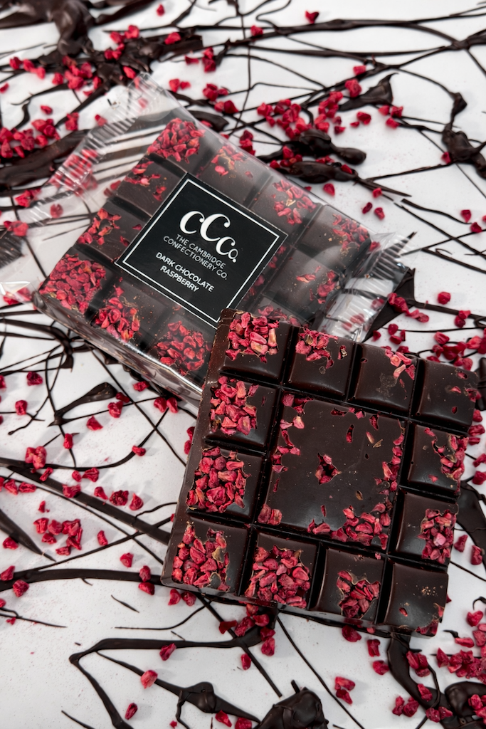 Ingredients: Cocoa Mass, Sugar, Cocoa Butter, Freeze Dried Raspberries (2%), Emulsifier: SOYA Lecithin (E322), Natural Vanilla Flavouring.