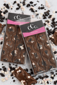Ingredients: Sugar, Cocoa Butter, Whole MILK Powder, Cocoa Mass, Cookie Pieces (WHEAT Flour, Sugar, Vegetable Oils (Palm Oil, Rapeseed Oil), Fat Reduced Cocoa Powder (4.5%), WHEAT Starch, Glucose-Fructose Syrup, Raising Agents: Potassium Carbonates, Ammonium Carbonates, Sodium Carbonates; Salt, Emulsifiers: SOYA Lecithin, Sunflower Lecithin; Flavouring), Mallows (Glucose-Fructose Syrup, Sugar, Water, Gelatine, Anti-Caking Agent: Maize Starch, Colours ( E162), Flavouring), Emulsifier: SOYA Lecithin (E322), Natural Vanilla Flavouring.