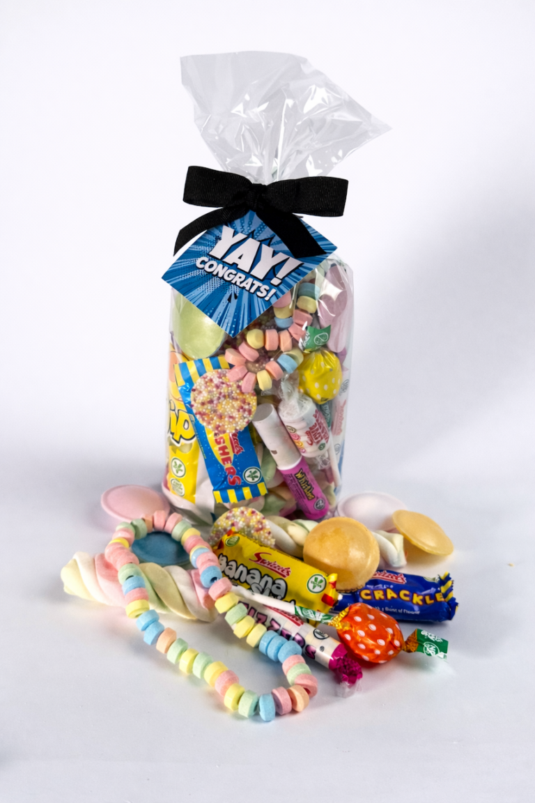 Say well done with a retro sweet treat to celebrate. This 250g bag is packed with a fun assortment of nostalgic sweets, which may include Love Hearts, marshmallows, lollies, candy necklaces, Flying Saucers, Dib Dabs and more.